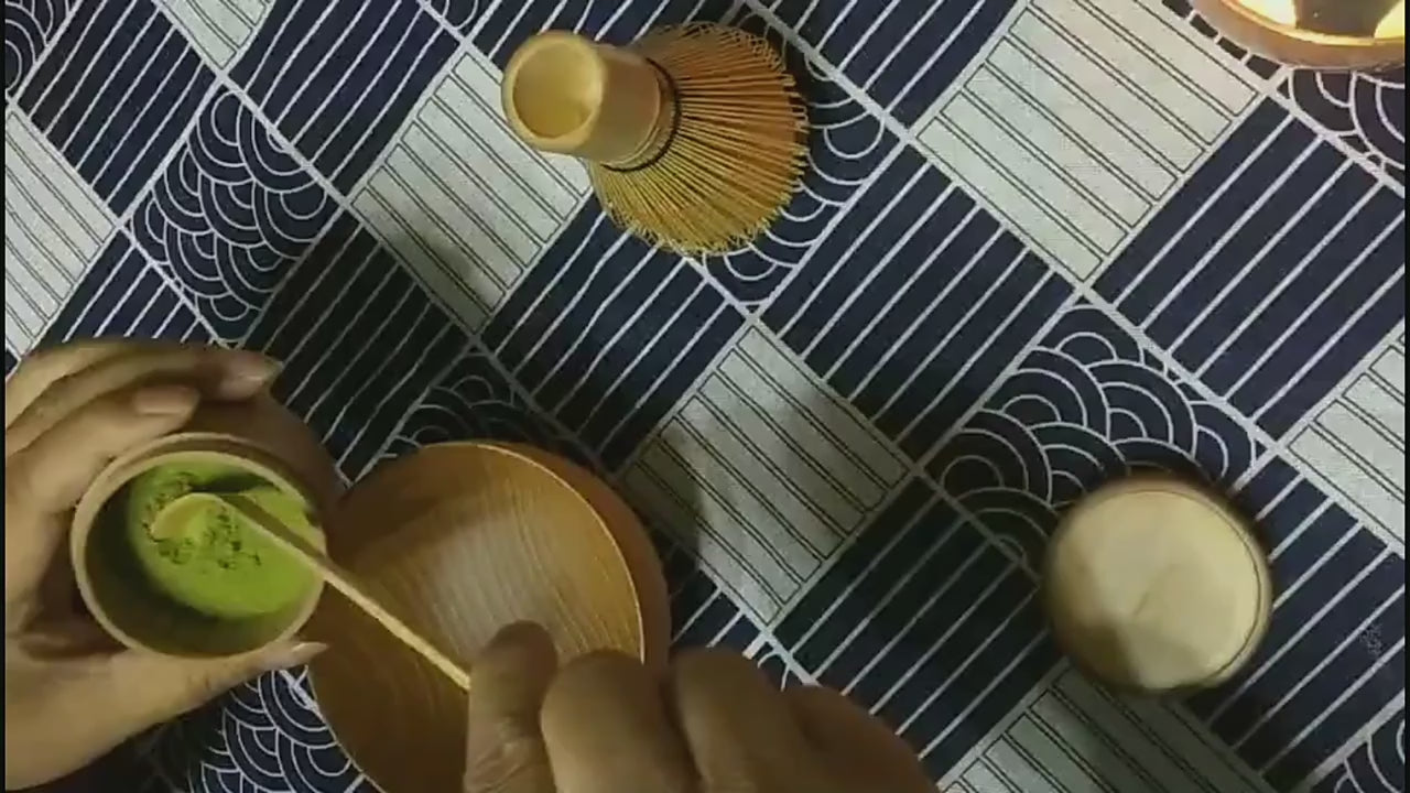 À l'aide du Chasen (fouet en bambou), fouettez rapidement le Matcha dans le sens de l'écriture « W » pour obtenir une mousse mousseuse.